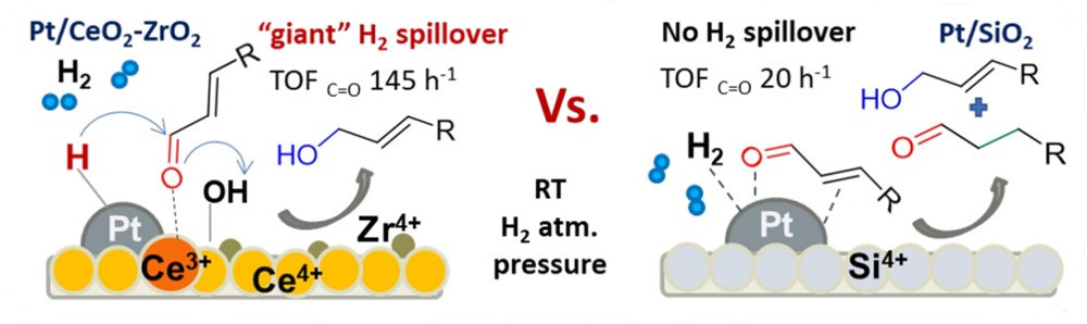 Ученые Лаборатории разработки и исследования полифункциональных катализаторов ИОХ РАН синтезировали катализатор на основе наночастиц платины, нанесенных на смешанный оксид CeO2-ZrO2. Исследования показали, что использование высокодефектного смешанного оксидного носителя позволяет стабилизировать платину в виде наночастиц размером < 2 нм и кластеров. Сильное взаимодействие Pt — носитель проявляется в возникновении эффекта «гигантского» низкотемпературного спилловера водорода, что обуславливает активацию водорода (ключевую стадию гидрирования) и образование центров Ce3+ на периферии взаимодействия частиц платины с носителем уже при отрицательных температурах. Возникающие центры Се3+ являются активными центрами адсорбции и активации карбонильной группы альдегидов. При этом, низкотемпературный спилловер водорода наблюдается и для катализаторов с ультранизким содержанием Pt < 0.1% масс. Таким образом, полученные катализаторы позволили селективно, с практически количественным выходом получать ненасыщенные спирты гидрированием ненасыщенных альдегидов (коричного альдегида и его производных, цитраля, цитронеллаля) в обычных условиях. Активность полученных систем в гидрировании карбонильной группы более чем в 15 раз превосходила активность катализаторов Pt/C, Pd/C, Pt/SiO2. Механизм гидрирования ненасыщенных альдегидов на катализаторе Pt/CeO2-ZrO2 кардинально отличается от того, который реализуется на стандартных промышленных катализаторах гидрирования с неактивными подложками, но с теми же текстурными характеристиками. Гидрирование коричного альдегида на Pd/C, Pt/C, Pt/SiO2 приводило к образованию насыщенного альдегида и продукту полного гидрирования.
