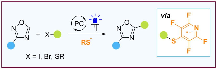 Радикальная функционализация ароматических соединений выгодно отличается от классического электрофильного и нуклеофильного замещения за счет мягкости условий протекания. В последние годы этот подход становится все более популярным за счет появления эффективных способов генерации свободных радикалов из различных функциональных групп в фотокаталитических условиях. В одной из последних работ ученых Лаборатории функциональных органических соединений ИОХ РАН был разработан метод радикальной функционализации 1,2,4-оксадиазолов – важнейших гетероциклических соединений, производные которых находят широкое применение в медицинской химии и агрохимии. В качестве предшественников свободнорадикальных частиц были использованы алкилгалогениды. Ключевой особенностью обнаруженного превращения является необходимость использования фторированной тиолятной соли, которая играет двойную роль. Во-первых, тиолят превращает алкилгалогениды в более реакционноспособные фторированные арилсульфиды, которые подвергаются фоторедокс активации связи C-S с образованием свободных радикалов. Во-вторых, тиолят-анионы взаимодействуют с промежуточными алкильными радикалами и превращают их в соответствующие сульфиды, тем самым уменьшая непродуктивный расход радикальных частиц. Последнее явление особенно важно для гетероциклов, проявляющих низкую реакционную способность к радикальному присоединению.