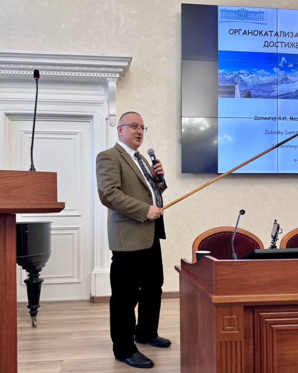 - Сергей Зурабович Вацадзе, заведующий Лабораторией супрамолекулярной химии, д.х.н., представил доклад «Органокатализаторы на базе биспидинов — достижения и перспективы», а также выступил в качестве председателя на докладах молодых ученых.