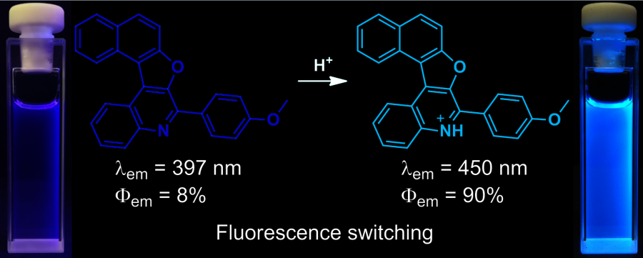 Исследователями Лаборатории гетероциклических соединений ИОХ РАН получены первые представители азаоксагелиценов фурохинолинового ряда – перспективных кандидатов для создания материалов для оптоэлектроники нового поколения. С помощью рентгеноструктурного анализа и квантовохимических расчетов было установлено, что фуранконденсированные соединения, в отличие от их углеродных аналогов, не подвергаются фотоциклизации типа Мэллори за счет увеличения расстояния между концевыми атомами углерода, что определяет их большую устойчивость к ультрафиолетовому излучению. Также было показано, что введение фурохинолинового фрагмента способствует увеличению интенсивности флуоресценции. Атом азота в этих молекулах может быть использован как для дальнейшей дериватизации, так и для модуляции оптических свойств, индуцированных кислотными агентами.