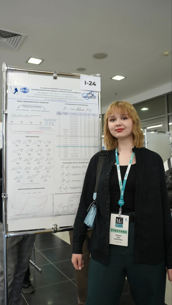 «На конференции я представляла работу, посвященную электрохимическому сочетанию в сераорганической химии. Этот подход позволяет получать β-кетосульфоны, используя “условно нематериальный” окислитель — электрический ток, минимизируя таким образом количество нерегенерируемых отходов и предварительных стадий синтеза. Работа выполнена под руководством к.х.н. Мулиной О.М.», — Лада Заикина.