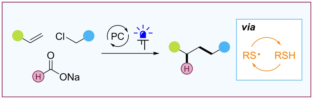 Исследователями Лаборатории функциональных органических соединений ИОХ РАН разработан эффективный метод восстановительного алкилирования неактивированных алкенов с использованием легкодоступных эфиров хлоруксусной кислоты в качестве алкилирующих агентов. В реакции используется дешевый и атом-экономичный восстановитель – формиат натрия. Процесс протекает при облучении синим светом, органический цианоарен выступает в роли фотокатализатора. Для успешного протекания превращения также необходима добавка тиола, который участвует в генерации ключевых восстанавливающих частиц, а также является источником атома водорода для промежуточных алкильных радикалов.