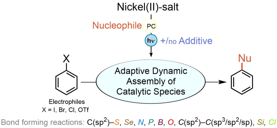 Обычно реакции кросс-сочетания на основе катализа солями переходных металлов проводят всегда в присутствии лигандов, то есть каких-то таких добавок, которые координируют металл и направляют его реакционную способность строго в определенном русле. И мы задались вопросом, насколько это вообще является необходимым условием и важно ли добавлять эти лиганды? С практической точки зрения это важно, потому что зачастую лиганды настолько дорогие, что они могут стоить даже дороже, чем сам металл. Синтез самих лигандов очень дорогой. В процессе исследования мы обнаружили, что да, действительно, лиганд не нужен в очень широком классе реакций кросс-сочетания. Показали, что мы можем создавать 8 типов связей, используя только лишь «голую» соль двухвалентного никеля без каких-либо лигандов. Мы брали соль никеля и два реактанта, которые участвуют в кросс-сочетании, добавляли туда мизерные количества вещества, которое называется фотокатализатор, и накачивали систему энергией света, то есть, светили на нашу реакционную смесь синим светом. Фотокатализатор может эту энергию усвоить и передать ее реактантам. Обнаружилось, что, действительно, для широкого класса реакций лиганд не нужен вообще, и реакция идет просто под действием тех комплексов, которые в этой смеси образуются. Их реакционной способности оказалось достаточно. В дальнейшем мы попытались объяснить причину наблюдаемых явлений. В ходе этих рассуждений мы пришли к концепции динамического адаптивного катализа и показали ее реальное практическое воплощение.