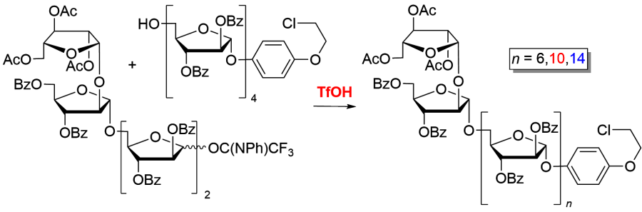Исследователями Лаборатории гликохимии ИОХ РАН была обнаружена необычная реакция олигомеризации арабинофуранозидов, протекающая в присутствии трифторметансульфоновой кислоты. В результате изучения механизма этого превращения было показано, что природа используемого кислотного катализатора оказывает значительное влияние на ход процесса. Полученные разработанным способом окта-, додека- и гексадекаарабинофуранозиды могут служить полезными блоками в синтезе олигосахаридных фрагментов полисахаридов Mycobacterium tuberculosis.