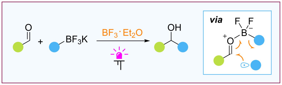 Исследователями Лаборатории функциональных органических соединений ИОХ РАН предложен принципиально новый подход к алкилированию альдегидов коммерчески доступными и стабильными при хранении алкилтрифторборатами калия. Реакция протекает при облучении видимым светом и включает предварительное комплексообразование карбонильной группы с дифторалкилбораном, генерирующимся in situ. В условиях реакции образующиеся комплексы легко взаимодействуют с алкильными радикалами, что сопровождается разрывом связи C–B и обеспечивает цепной характер процесса. Обнаруженное превращение применимо к широкому кругу ароматических альдегидов и не требует использования фотокатализатора.