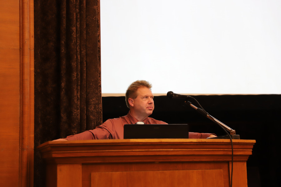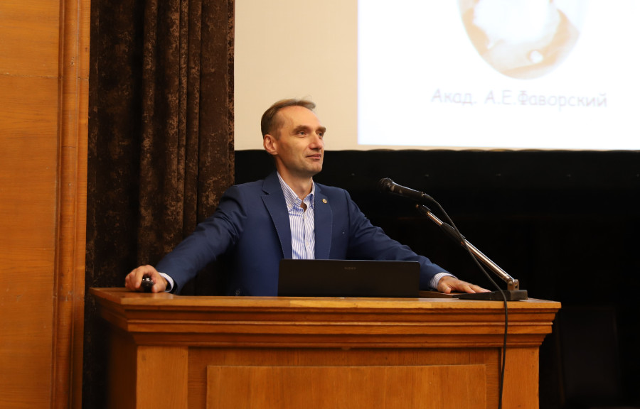 Далее слово взял Александр Олегович Терентьев, член-корреспондент РАН, директор ИОХ РАН, заведующий Лабораторией исследования гомолитических реакций. Он тепло поприветствовал студентов и подчеркнул важность химии в современной промышленности, которая все больше нуждается в новейших научных разработках.