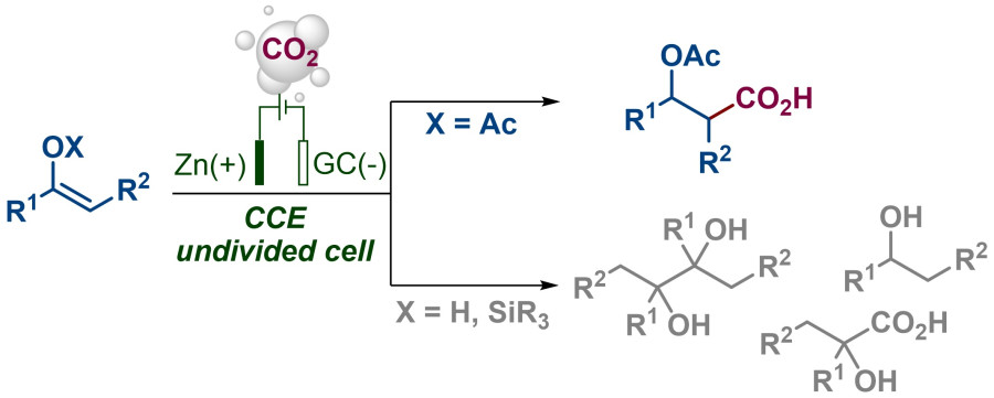В ИОХ РАН совместно с китайскими коллегами предложен способ электрохимического гидрокарбоксилирования производных енолов с использованием СО2. Продуктами синтеза являются ценные труднодоступные другими методами карбоновые кислоты. Использование в качестве субстратов электролиза ацетатов енолов позволяет получать β-ацетоксикарбоновые кислоты, в отличие от электролиза кетонов, силиловых эфиров и винилтозилатов с СО2, приводящим, в основном, к спиртам.