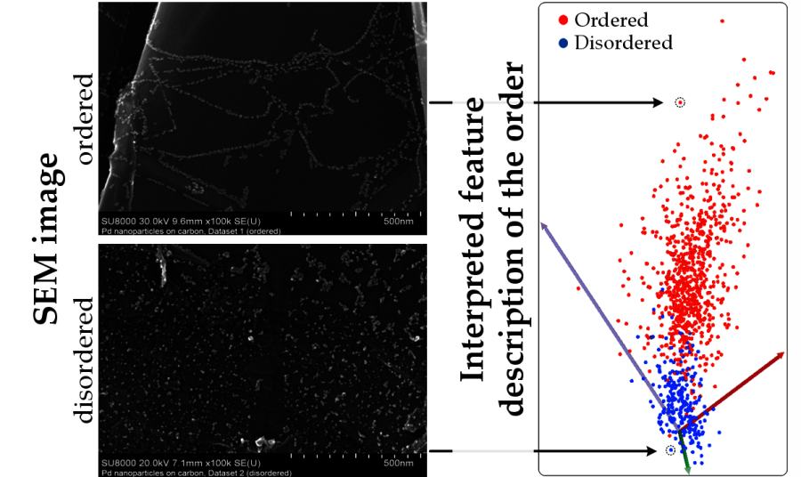 Учеными Лаборатории металлокомплексных и наноразмерных катализаторов ИОХ РАН предложен инновационный метод машинного обучения, способный различать углеродные материалы с упорядоченным и неупорядоченным расположением дефектов, отмеченных прикреплением наночастиц палладия. Подход включает высокопроизводительный расчет различных признаков из двух основных групп: ориентаций наночастиц и построения полилиний. Разработанный метод может лечь в основу более общего показателя упорядоченности — степени упорядоченности. Исследователи также продемонстрировали, что упорядоченность наночастиц тесно связана с динамическими процессами, происходящими в химических реакциях. Применение предложенных моделей окажет существенное влияние на автоматизацию анализа изображений СЭМ в исследованиях углеродных материалов и материаловедении в целом.