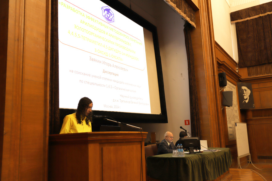 В ходе заседания диссертационного совета ИОХ РАН Игорю Заякину присудили ученую степень кандидата химических наук по специальности 1.4.3 – «органическая химия».