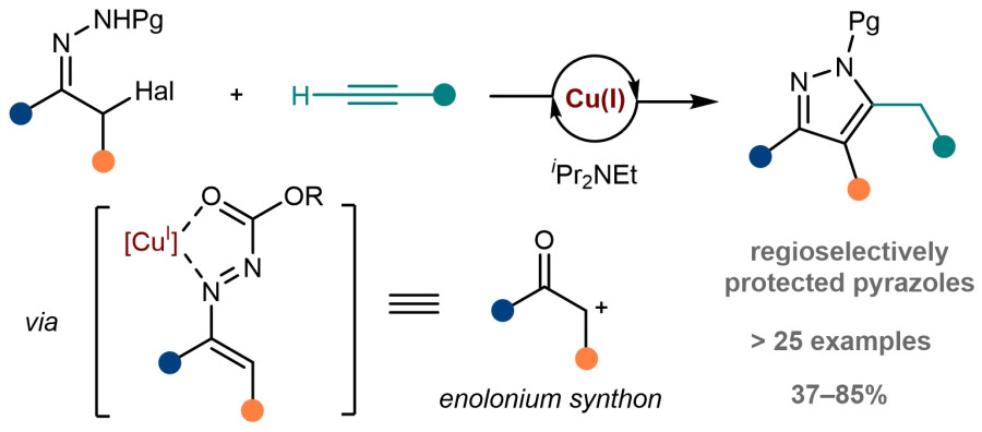 Ученые Лаборатории органических и металлорганических азот-кислородных систем ИОХ РАН разработали процесс алкинилирования ароматических α-галогенгидразонов терминальными алкинами, катализируемый соединениями меди (I). Полученные разнообразные α-алкинилзамещенные гидразоны легко претерпевают реакцию циклизации, в результате чего региоселективно получаются N-защищенные пиразолы. Гетероциклы, имеющие характер замещения, аналогичный полученным структурам, встречаются среди фармацевтически значимых веществ с противовоспалительной, противораковой, антигипертензивной и антигипергликемической активностью. Таким образом, предложенный синтетических подход может рассматриваться как универсальный метод сборки ценных производных пиразола из легкодоступных соединений.