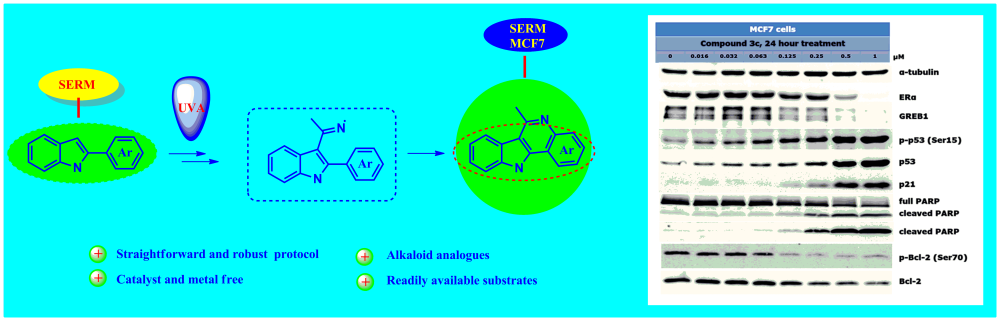 Учеными Лаборатории гетероциклических соединений им. академика А.Е. Чичибабина ИОХ РАН был предложен фотохимический метод получения аналогов природного алкалоида – изокриптолепинов – из ацилоксимов на основе 3-ацетил-2-арилиндолов, ключевым интермедиатом которого является азот-центрированный иминильный радикал. Оценка антипролиферативной активности полученных изокриптолепинов показала, что они проявляют (суб)микромолярную ингибирующую активность против тестированных клеток РМЖ. Антипролиферативные свойства лидерного соединения значительно превосходили 4-гидрокситамоксифен, известный препарат для лечения гормонозависимых видов рака молочной железы. Было также найдено, что полученные индолохинолины проявляют антиэстрогенную активность, что может указывать на селективность исследуемых веществ к клеткам РМЖ, экспрессирующим рецептор эстрогена α (ERα). Полученные результаты могут послужить основой для дальнейших исследований аналогов изокриптолепинов с целью поиска эффективных препаратов для лечения агрессивных форм рака молочной железы.