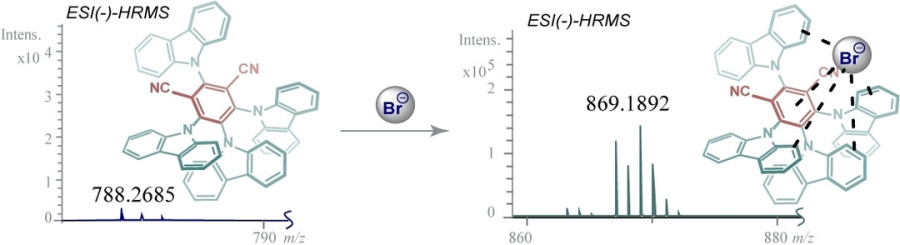 Исследователями Лаборатории металлокомплексных и наноразмерных катализаторов ИОХ РАН разработан новый подход, использующий масс-спектрометрию с ионизацией электрораспылением для визуализации фотокатализаторов на основе цианоаренов, используя их специфическое супрамолекулярное взаимодействие с анионами брома. Добавление субстехиометрических количеств бромид-анионов позволяет обнаружить интенсивные сигналы в масс-спектрах высокого разрешения, соответствующие исходному фотокатализатору и определенным продуктам превращения, образующимся в присутствии радикальных интермедиатов, генерируемых в ходе фотокаталитических реакций. Такой метод облегчает мониторинг поведения цианоареновых фотокатализаторов в реакционной системе, предоставляя возможность для детального исследования механизма реакции.