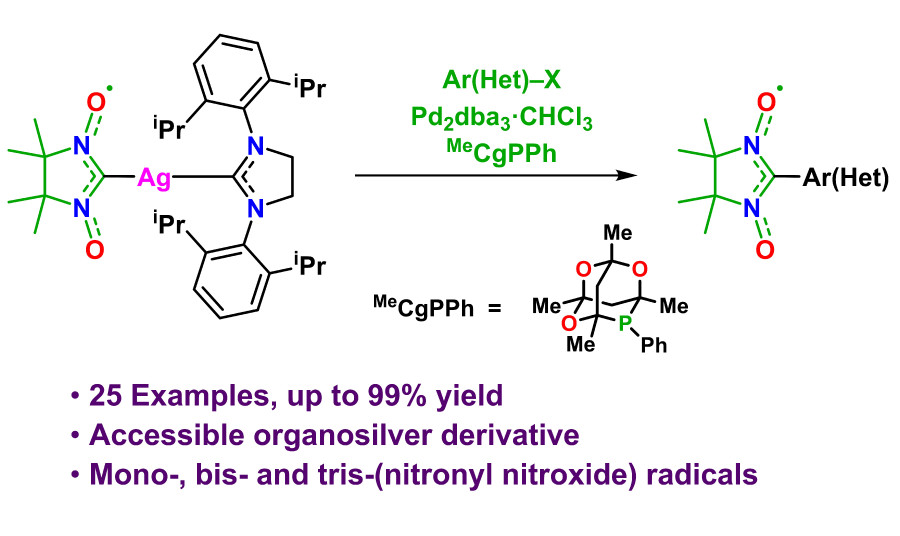 Исследователями Лаборатории гетероциклических соединений им. академика А.Е. Чичибабина ИОХ РАН разработаны первые нитронилнитроксильные производные серебра (I), стабилизированные стерически затрудненными N-гетероциклическими карбеновыми лигандами. По своей эффективности в реакциях кросс-сочетания синтезированные сереброорганические соединения не уступают золотым производным, что продемонстрировано синтезом широкого ряда арил- и гетарил-замещенных нитронилнитроксилов, различных моно-, би-, три- и тетрарадикальных производных.