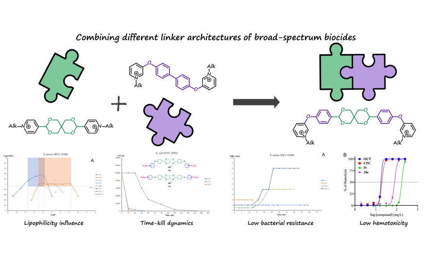 Катионные биоциды — это класс антимикробных агентов, которые нашли широкое применение в здравоохранении, пищевой промышленности, сельском хозяйстве и в быту. Наиболее распространенными представителями катионных биоцидов являются четвертичные аммониевые соединения (ЧАС). Их действие основано на связывании с отрицательно заряженными компонентами мембран бактериальных клеток, что приводит к разрушению мембраны и утечке клеточного содержимого. Внутри ЧАС можно выделить особый класс – бис-четвертичные аммониевые соединения (бис-ЧАС), характеризующийся наличием двух или разных положительно заряженных аммониевых ядер, соединенных гибким или жестким линкером. бис-ЧАС часто демонстрируют превосходное антимикробное действие по сравнению с их моноаналогами из-за повышенной плотности положительного заряда и структурной сложности.