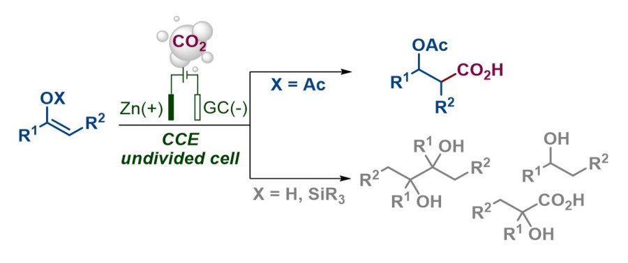 В данной работе мы изучали реакционную способность различных енольных производных (силиловых эфиров енолов, винил тозилатов, енолацетатов) в реакции электрохимического гидрокарбоксилирования с использованием диоксида углерода. Из всех представленных соединений наиболее перспективными оказались енолацетаты, поскольку в условиях реакции нам удалось получить достаточно селективно продукт присоединения CO2 — β-ацетоксикарбоновые кислоты. Это было несколько неожиданным, поскольку обычно енол ацетаты в условиях электролиза претерпевают окисление, а ацетокси-группа может восстанавливаться, хотя в нашем случае данный фрагмент сохраняется.