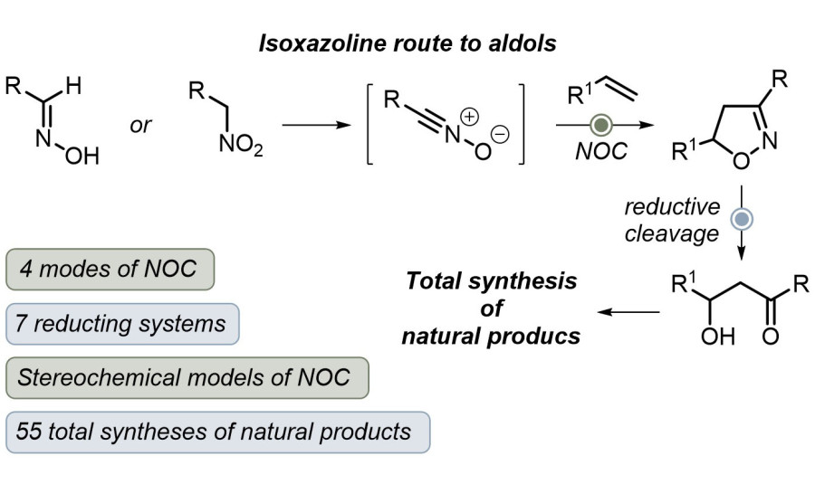 Альдольная реакция является фундаментальным превращением, широко используемым химиками-органиками. Она позволяет не только конструировать новые связи углерод-углерод, но и формировать новые стереогенные центры, что делает ее незаменимым инструментом в полном синтезе стереохимически сложных природных молекул. Классическая альдольная конденсация представляет собой кислотно-основно катализируемую реакцию альдегида или кетона с енолизируемыми карбонильными соединениями. В конце прошлого века был предложен альтернативный подход к синтезу альдолей, а именно реакция [3 + 2]-циклоприсоединения между нитрилоксидом и алкеном с последующим гидролитическим расщеплением полученного изоксазолинового фрагмента. Изоксазолиновый путь получения альдолей часто используется в синтезе природных соединений, особенно за последние 25 лет. За эти годы были разработаны новые стереоселективные методы циклоприсоединения оксидов нитрилов к алкенам и появились новые методы восстановления, которые совместимы с различными функциональными группами.