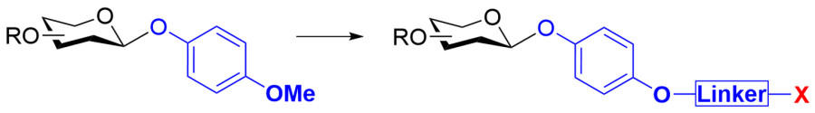 Исследователями Лаборатории гликохимии ИОХ РАН в одной из последних работ были найдены условия функционализации 4-метоксифенильного агликона, которая в оптимизированных условиях протекает с высокими препаративными выходами. Ключевой стадией является селективное удаление метильной группы из 4-метоксифенильного агликона. Последующее замещение фенольной гидроксильной группы в полученных 4-гидроксифенил-гликозидах различными алкилирующими агентами эффективно приводит к образованию соответствующих целевых гликозидов с разнообразными функциональными группами в агликоне. Разработанный синтетический подход позволяет получать производные с функциональными группами в агликоне на любой стадии синтеза олигосахарида из единого предшественника с 4-метоксифенильным агликоном. Полученные результаты свидетельствуют о том, что 4-метоксифенильный агликон можно рассматривать как удаляемый агликон-преспейсер (Янус-агликон).