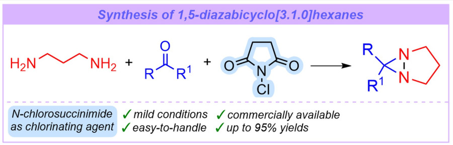 Учеными Лаборатории азотсодержащих соединений ИОХ РАН разработан подход к синтезу бициклических диазиридинов – 1,5-диазабицикло[3.1.0]гексанов. Основная особенность метода – использование N-хлорсукцинимида в качестве удобного и простого в обращении хлорирующего агента, который в сочетании с карбонильными соединениями и 1,3-диаминопропаном позволяет получать широкий круг целевых диазиридинов. Высокие выходы продуктов, структурное разнообразие и возможность масштабирования для получения граммовых количеств конечных структур демонстрируют широкую применимость предложенной методологии получения диазиридинов для дальнейших исследований.