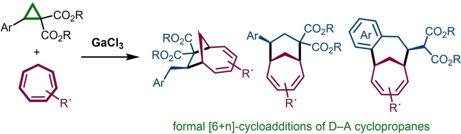 В данной работе мы продолжили изучать химию ДАЦ в реакциях с различными перехватчиками в присутствии кислот Льюиса. Нами были открыты новые классы процессов формального [6+n]-циклоприсоединения и аннелирования (n = 1, 2, 3, 4) ДАЦ с три-, тетра- и пентаметилзамещенными циклогептатриенами. Реакция протекает в условиях активации трихлоридом галлия, что позволяет эффективно генерировать как 1,2-, так и 1,3-цвиттер-ионные галлиевые комплексы из исходных ДАЦ, когда другие кислоты Льюиса оказываются неселективными. В результате были разработаны эффективные подходы к синтезу серии полифункциональных каркасных соединений с высокими выходами и регио- и диастереоселективностью. Кроме того, было показано влияние степени замещенности циклогептатриенов на направление протекающих процессов. Также нами было обнаружено, что незамещенный циклогептатриен при взаимодействии с цвиттер-ионными комплексами ДАЦ выступает хорошим источником гидрид-аниона, что позволяло получить алкилзамещенные малонаты.