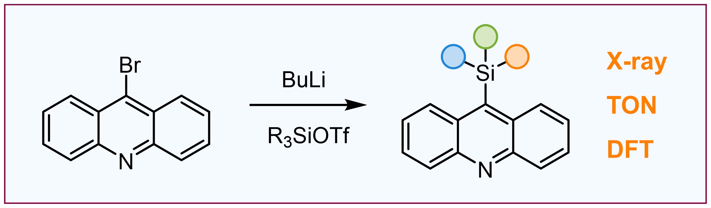 Исследователями Лаборатории функциональных органических соединений ИОХ РАН впервые получен ряд силилированных и алкилированных акридинов. Было обнаружено, что силилакридины проявляют каталитическую активность, сравнимую с известными ранее арилакридинами. Показано, что стерически затрудненные силилированные акридины более эффективны, чем 9-фенилакридин, но менее эффективны, чем наиболее распространённый 9-мезитилакридин. На основании квантово-химических расчётов было показано, что структурные напряжения являются основным фактором, приводящим к искажению молекул силилированных и алкилированных акридинов.