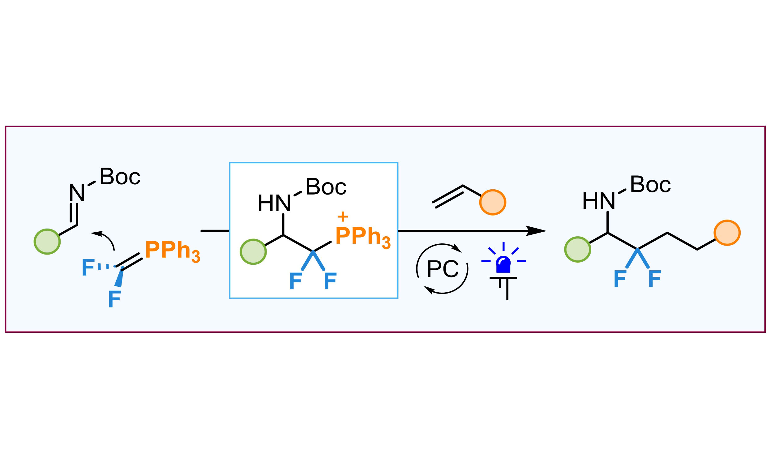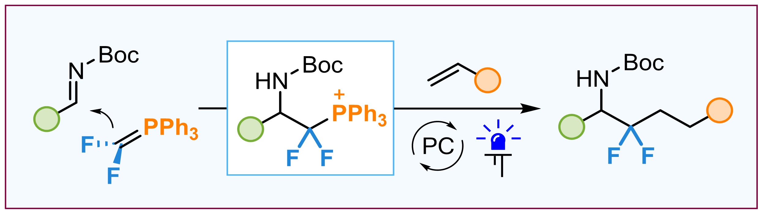 В рамках создания общей стратегии синтеза гем-дифторированных соединений на основе дифторкарбена и его эквивалентов учеными Лаборатории функциональных органических соединений ИОХ РАН был предложен однореакторный метод получения гем-дифторированных N-Boc-защищённых аминов без использования переходных металлов. На первом этапе N-Boc-имины реагируют с генерируемым in situ фосфорным илидом, образуя гем-дифторированные фосфониевые соли, которые затем служат источником дифторалкильных радикалов в условиях фотопромотируемой окислительно-восстановительной реакции. Последующее легкое удаление Boc-группы из продуктов приводит к образованию дифторированных гидрохлоридов первичных аминов.