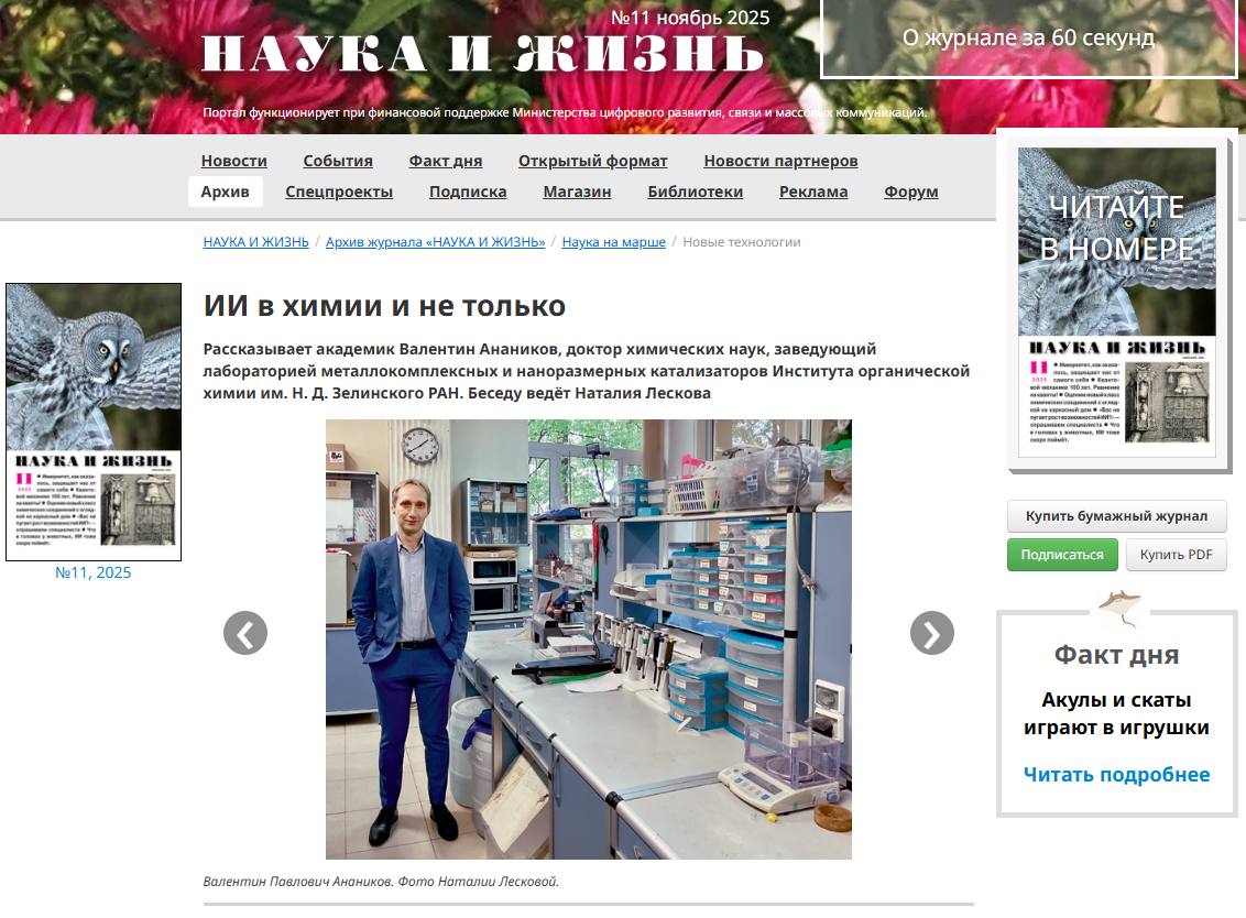 В новом номере журнала «Наука и жизнь» опубликовано большое интервью с академиком Валентином Павловичем Ананиковым, д.х.н., заведующим лабораторией металлокомплексных и наноразмерных катализаторов ИОХ РАН.