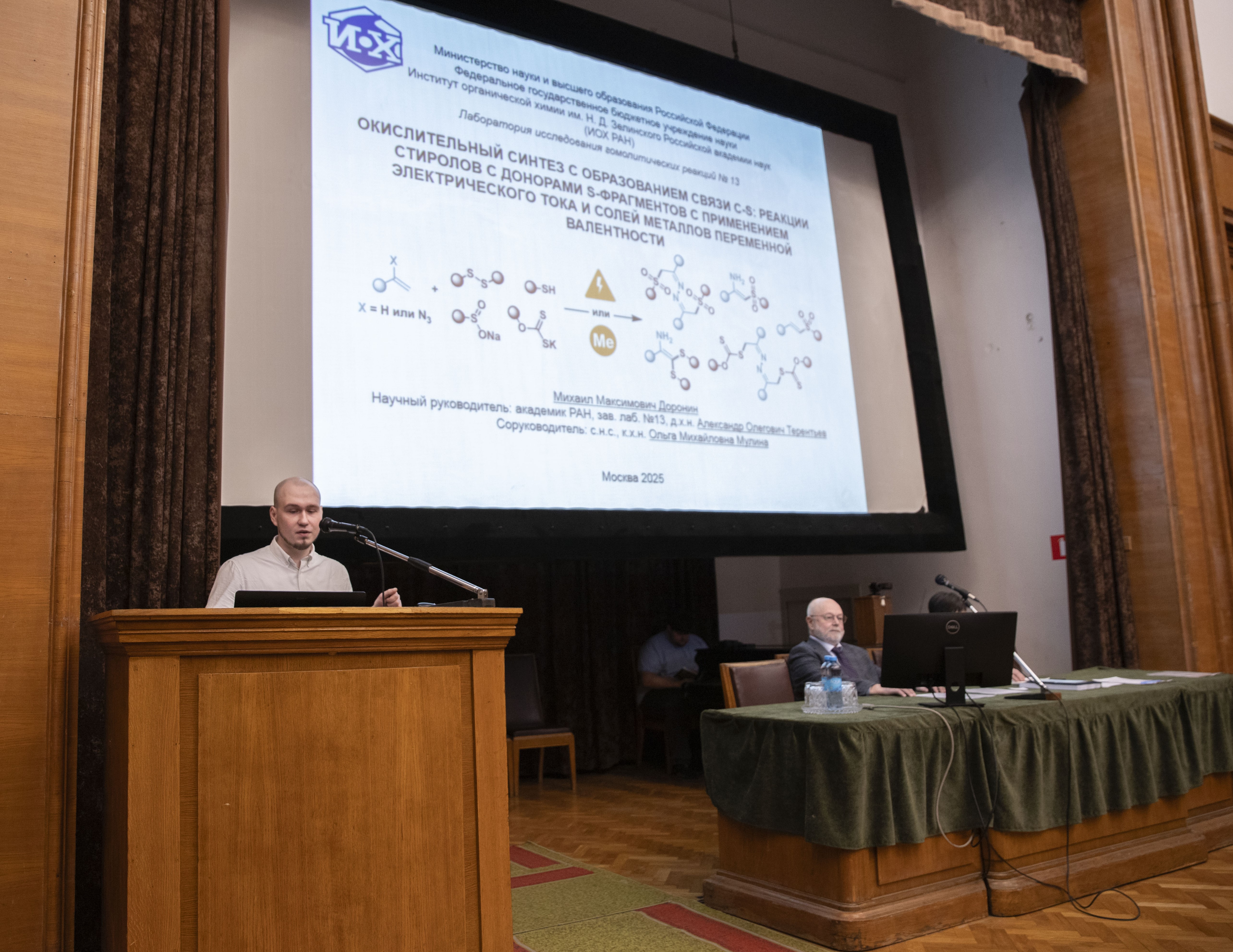 Доронин Михаил Максимович представил диссертацию на соискание ученой степени кандидата химических наук «Окислительный синтез с образованием связи C-S: реакции стиролов с донорами S-фрагментов с применением электрического тока и солей металлов переменной валентности».