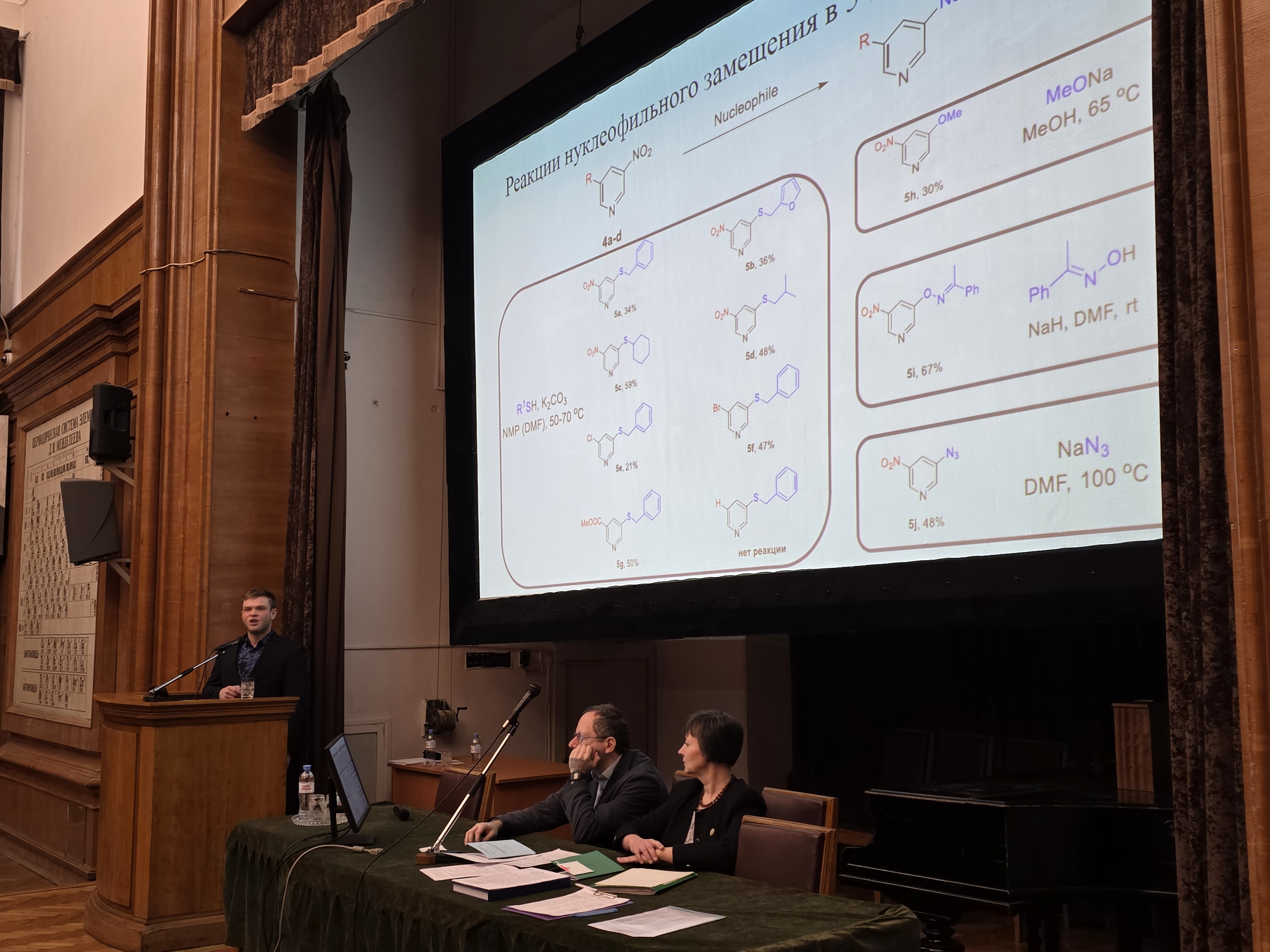 Никольский Владислав Владимирович представил диссертацию на соискание ученой степени кандидата химических наук «Синтез азолопиридинов на основе реакций нуклеофильного ароматического замещения нитрогруппы в 3-нитропиридинах».