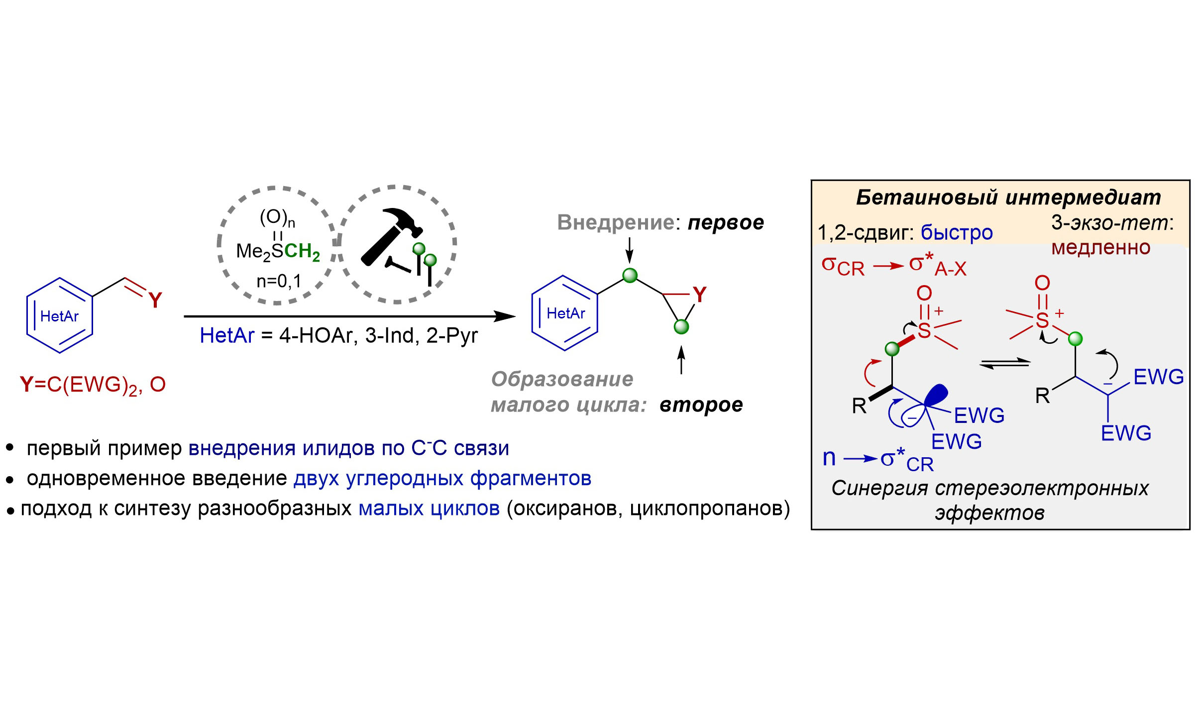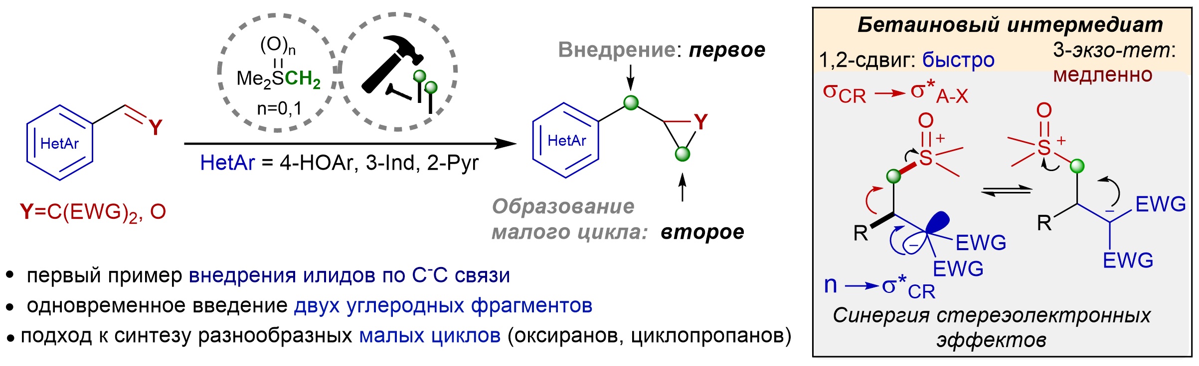 В совместной работе ученых Лаборатории направленной функционализации органических молекулярных систем, МГУ им. М.В. Ломоносова и Университета Флориды (США) обнаружен необычный каскад превращений, позволяющий осуществить двойной перенос метиленового фрагмента от илида сульфоксония к алкенам определенного типа в результате внедрения метиленовой группы по связи углерод-углерод и последующего циклопропанирования. Аналогичный по результату процесс идет при взаимодействии илида сульфония с соответствующими альдегидами. Разработанное превращение позволяет селективно получать бензилциклопропаны и бензилоксираны – ценные промежуточные продукты в органическом синтезе. Механистические исследования объяснили, какие структурные особенности субстратов необходимы для реализации необычной реакционной способности изученных илидов, и показали, что новые реакции становятся возможными благодаря тесно скоординированной сети стереоэлектронных взаимодействий в выбранных субстратах. На основании этого анализа предположено, что подобная методология применима и для других типов субстратов, для которых возможны аналогичные стереоэлектронные взаимодействия.