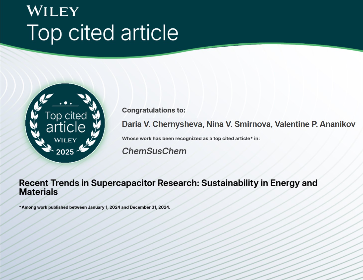Обзорная статья, подготовленная, сотрудниками ИОХ РАН и ЮРГПУ(НПИ), получила высокую международную оценку и вошла в число наиболее цитируемых публикаций журнала ChemSusChem в 2025 году.