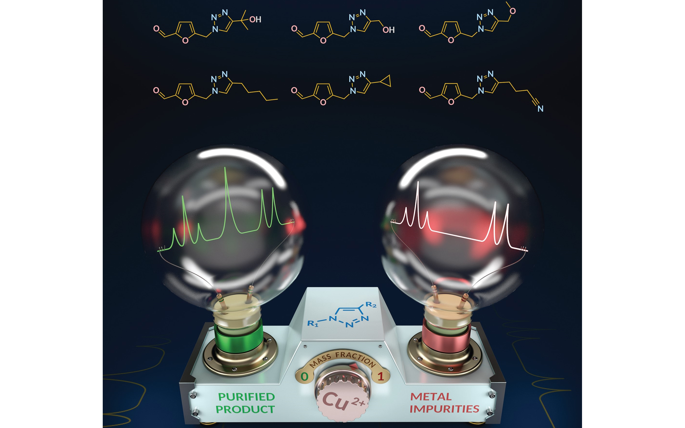 Учеными Лаборатории металлокомплексных и наноразмерных катализаторов ИОХ РАН было обнаружено необычное явление в ЯМР спектрах триазолов, полученных по классической реакции медь-катализируемого азид-алкинового циклоприсоединения: было зафиксировано исчезновение двух сигналов триазольного цикла в 13CЯМР спектре, а также уширение сигнала CH в 1HЯМР спектре. Предположительно, причиной этого эффекта стал процесс динамического комплексообразования, в котором участвуют парамагнитные ионы меди, оставшиеся после каталитического процесса, и продукт реакции – производное триазола.