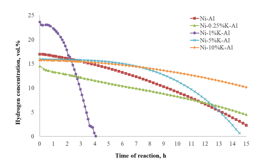 ✓ Методом горения растворов был приготовлен набор катализаторов, содержащих 0,25–10 мас.%K2O. Каталитические системы охарактеризованы методами рентгеновской дифракции, просвечивающей электронной микроскопии, сканирующей электронной микроскопии и низкотемпературной адсорбции азота. Каталитическое разложение метана проводили при давлении 0,5 МПа, 100 лCH4/(ч⋅г) и температуре от 550 до 750 °C. Установлено, что изменение содержания калия приводит к изменению фазового состава и текстурных характеристик полученных катализаторов. Введение калия (0,25 мас.% K2O) в никелевый катализатор позволило изменить гранулометрический состав в сторону образования более мелких частиц — от 5-30 нм до 5-10 нм, способствуя образованию более высокого выхода H2. Катализаторы Ni-0,25%K2O/Al2O3 и Ni-1%K2O/Al2O3 продемонстрировали наибольший выход водорода 11,6 г/гкат и 17,0 г/гкат с максимумом при 675 и 750 °C соответственно. Наибольший выход углеродного материала (51,0 г/гкат) получен на катализаторе Ni-1%K2O/Al2O3.