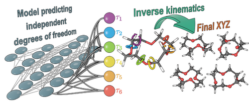 ✓ In 2023–2024, a conformational search algorithm based on the inverse kinematics method, Ringo, was developed and implemented (https://github.com/TheorChemGroup/Ringo). The algorithm enables the analysis of conformational flexibility in any polycyclic molecule using inverse kinematics and identifies the molecule’s degrees of freedom — that is, the set of dihedral angles capable of independent rotation while keeping bond lengths and valence angles fixed.