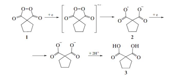 ✓ Проведено исследование электрохимического восстановления спироциклопентил-малонилпероксида в водной среде методом циклической вольтамперометрии на золотом стационарном электроде. На основании расчетов, произведенных по параметрам циклических вольтамперограмм, снятых при разных скоростях развертки, сделан вывод о двух одноэлектронных последовательных процессах восстановления исследуемого пероксида и предложена схема его катодного восстановления.