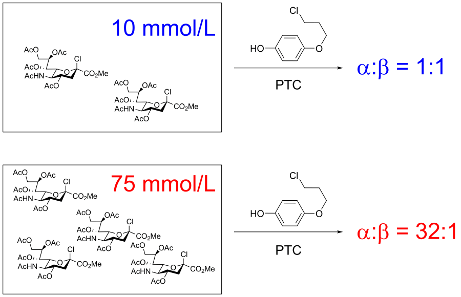 Межфазный катализ (МФК) широко используется в гликохимии для получения арилгликозидов реакцией гликозилирования. Исследуя возможность синтеза 4-(3-хлорпропокси)фенилсиалозида (Neu5Ac-OCPP) из N-ацетилсиалилхлорида с О-ацетильными группами (1), мы недавно обнаружили сильную зависимость результата гликозилирования в условиях МФК от режима смешения реагентов: в колбе был получен только α-аномер Neu5Ac-OCPP, хотя и с низким выходом (13%), тогда как в микрофлюидных условиях выход Neu5Ac-OCPP увеличивался до 36%, хотя стереоселективность снижалась (α/β ≤ 6.2). В данной работе обнаружено, что результат этой реакции, проведенной в микрофлюидных условиях с использованием микромиксера Comet X-01 (при скорости потока 2 мкл/мин), нелинейно зависит от концентрации N-ацетилсиалилхлорида 1 (5–200 ммоль/л). Целевой Neu5Ac-OCPP получен с заметно более высоким выходом (до 66%), сопровождающимся повышенной стереоселективностью (α/β = 17:1 – 32:1) в области высоких концентраций (C > 50 ммоль/л), тогда как выход (10-36%) и особенно стереоселективность (α/β = 0.9:1–6.2:1) были заметно ниже в диапазоне низких концентраций (C ≤ 50 ммоль/л). Столь резкое скачкообразное увеличение стереоселективности выше критической концентрации (50 ммоль/л), по-видимому, связано с изменением презентации молекул на поверхности супрамеров гликозил-донора, существующих в различных диапазонах концентраций. [DOI: 10.3390/catal13020313]