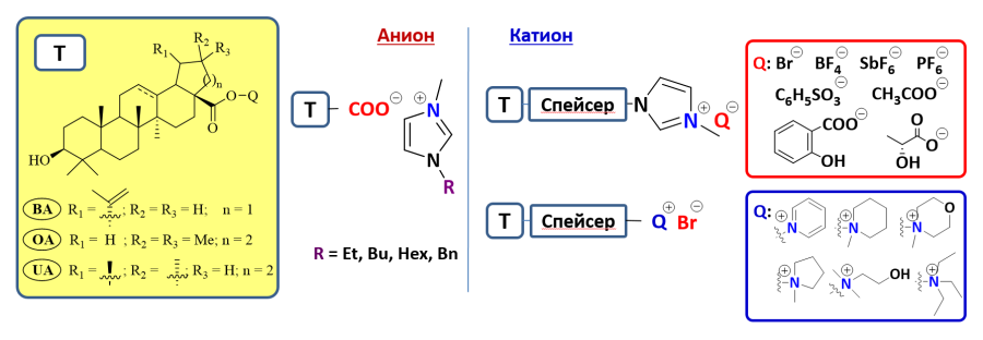 Осуществлен синтез ионных соединений, в которых пентациклические тритерпеноиды выступают как в виде анионов, так и катионов, показана селективная цитотоксичноть, индукция апоптоза по внутреннему (митохондриальному) пути, разобщение окисления и фосфорилирования, ингибирование PI3K/Akt/mTOR сигнального пути, арест клеточного цикла [Cancers, 2023, 15(3), 756 (IF 5.2)].