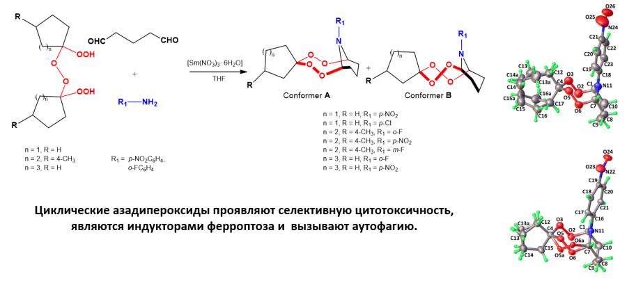 Разработан оригинальный метод синтеза ранее неописанных мостиковых тетраоксазаспиробициклоалканов многокомпонентной реакцией первичных ариламинов с 1,1'-пероксибис(1-гидропероксициклоалканами) и пентан-1,5-диалем в присутствии нитрата самария в качестве катализатора. Установлено, что бициклические азапероксиды существуют в растворе дейтерированного хлороформа и в кристаллической фазе в виде смеси конформеров кресло-лодка-кресло и твист-кресло-кресло, что обусловлено высокими барьерами инверсии гетероцикла. Установлено, что новые бициклические азапероксиды проявляют высокую цитотоксическую активность в отношении опухолевых клеточных линий Jurkat, K562 и U937, и низкую цитотоксичность к нормальным фибробластам. Продемонстрирован высокий потенциал этих соединений в отношении индукции ферроптоза и аутофагии, сопоставимые с действием артесуната [JOC, 2023, 88(16), 11473 (IF 3.6); ChemistrySelect, 2023, 8(37), e202302044 (IF 2.1].