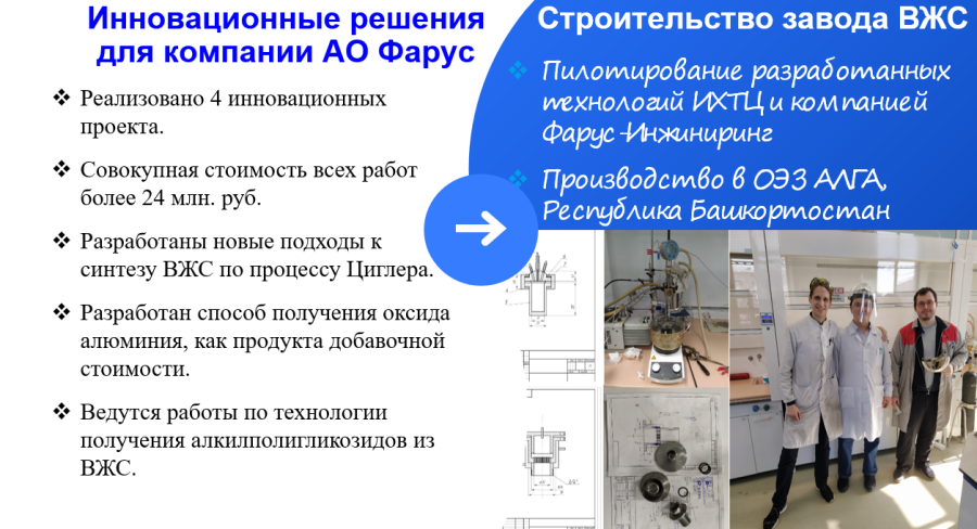 ✓ Разработка инновационных решений для технологии производства высших жирных спиртов (ВЖС) (совместно с гр. 37 ИОХ РАН)