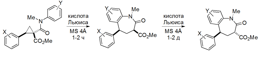 ✓ Разработан метод синтеза бенз[b]азепинов, основанный на рециклизации 2,N-диарил-1-карбамоилциклопропанкарбоксилатов (26 примеров, выход до 92%). При использовании амидов на основе индолина и тетрагидрохинолина были получены трициклические аналоги биоактивных алкалоидов. Доказано, что реакция протекает с обращением конфигурации электрофильного атома углерода в трехчленном цикле, т.е. представляет собой первый пример 6-эндо-тет-циклизации и в целом первый пример эндо-тет-процесса, приводящий к образованию цикла. Полученные результаты показывают, что правила Болдуина для циклизаций требуют дополнения для процессов, включающих реакции малых циклов. Найдено, что диастереоселективность процесса зависит от времени реакции: через 1-2 часа заместители при атомах С(3) и С(5) в продукте расположены по одну сторону цикла (цис); если перемешивать реакционную смесь 1-2 дня, продукт имеет исключительно транс-расположение этих заместителей.