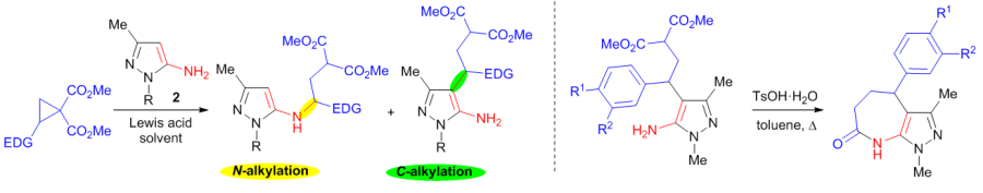 ✓ Изучено взаимодействие донорно-акцепторных циклопропанов с 5-амино-1,3-диметилпиразолом и его производными. Показано, что в присутствии кислоты Льюиса 5-аминопиразолы ведут себя по отношению к циклопропанам как амбидентные нуклеофилы, образуя продукты алкилирования либо по атому С(4) пиразольного цикла, либо по экзоциклической аминогруппе. Определено влияние заместителей и условий проведение реакции на селективность процесса; найдены условия для селективного N-алкилирования. Показано, что некоторые циклопропаны могут образовывать исключительно продукты C-алкилирования в определенных условиях. При нагревании с кислотой продукты С-алкилирования были превращены в производные пиразоло[4,3-b]азепина, проявляющие высокое сродство по отношению к глюкокортикостероидным рецепторам, а продукты N-алкилирования – в производные 5-арил-1-(пиразол-3-ил)пирролидин-2-она.