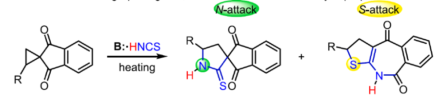 ✓ Тиоцианат-содержащие протонные ионные жидкости применены в качестве реагентов тройного действия (регенерируемый растворитель, источник протона — кислотный катализатор и нуклеофил) для раскрытия цикла донорно-акцепторных циклопропанов. Впервые продемонстрирована амбидентность тиоцианат-иона при раскрытии донорно-акцепторного циклопропанов на основе 1,4-индандиона как функция основания, образующего протонную ионную жидкость. В зависимости от используемой протонной ионной жидкости в результате домино реакции образуются либо 2-тиоксоспиро[пирролидин-3,2'-индан-1',3'-дионы] (продукт формального раскрытия циклопропана атомом азота тиоцианат иона с последующей внутримолекулярной атакой СН-кислотного атома по атому углерода изотиоцианата), либо тиено[2,3-c][2]бензазепины (продукты раскрытия малого цикла атомом серы и последующих вторичных реакций образовавшегося тиоцианата).