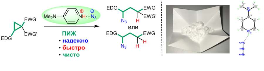 ✓ Разработан стабильный, невзрывчатый, малогигроскопичный источник азид-иона, растворимый как в протонных, так и во многих апротонных органических растворителях — азид 4-(диметиламино)пиридиния. Показано также, что при использовании его раствора в протонных ионных жидкостях он выступает в качестве безопасного эквивалента токсичной и нестабильной азотистоводородной кислоты. Термохимическими методами показано, что данный азид разлагается с поглощением, а не с выделением энергии. Синтетическая значимость разработанного реагента продемонстрирована на примере реакций нуклеофильного раскрытия донорно-акцепторных циклопропанов и оксиранов, циклоприсоединения к нитрилам и изотиоцианатам. Для широкой серии донорно-акцепторных циклопропанов определена их относительная реакционная способность по отношению к этому реагенту.
