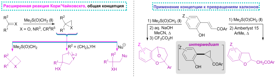 ✓ Предложен новая концепция получения разнообразных органических соединений — использование «расширенной» реакции Кори-Чайковского в дополнение к классическому варианту этой реакции и её «прерванной» версии. Эта концепция подразумевает превращение образующихся в реакции Кори-Чайковского трехчленных циклов без их выделения в более сложные продукты в результате домино-реакции или при добавлении к образовавшейся смеси новых реагентов, инициируя превращение «в одном реакторе». Предложенная концепция использована для превращения коммерчески доступных или легко синтезируемых халконов в бензаннелированные 2,8-диоксабицикло[3.2.1]октаны и в 2,3-дигидробензофураны.