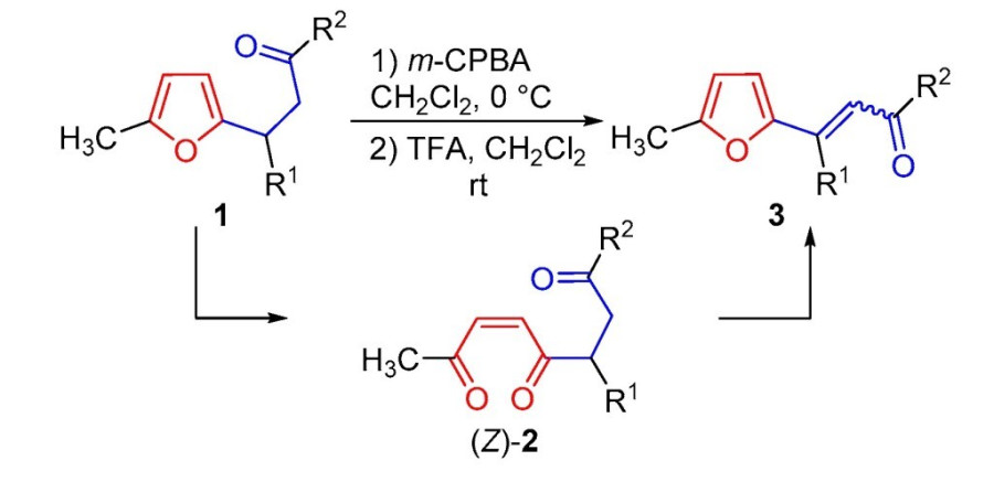 ✓ Разработан метод синтеза 3-(2-фурил)-1,3-ди(гет)арилпроп-2-ен-1-онов, основанный на окислительной рециклизации 3-(2-фурил)-1,3-ди(гет)арилпропан-1-онов, протекающий в результате окислительного раскрытия фуранового цикла с образованием ди(гет)арил-замещенных 2-ен-1,4,7-трионов с последующим образованием фурана из фрагмента насыщенного дикетона. В результате заместители, присутствовавшие в фурановом цикле, оказываются в боковой цепи, и наоборот.