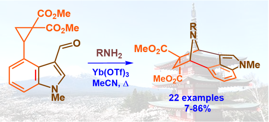 ✓ Разработан метод синтеза соединений с беспрецедентным тетрациклическим скелетом, содержащим фрагмент тропана, пери-аннелированный к индольному ядру, на основе реакции 3-формилиндол-4-ил-замещенного донорно-акцепторного циклопропана с анилинами и другими первичными аминами. Продукты включают в себя сразу 4 известных фармакофора — тропан, индол, фрагменты b-аминокислоты и g-аминомасляной кислоты.