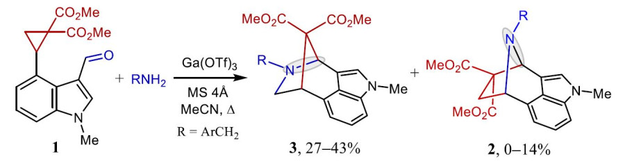 ✓ Обнаружено, что взаимодействие 3-формилиндол-4-ил-замещенных донорно-акцепторных циклопропанов с бензиламинами и их гетероциклическими аналогами приводит к преимущественному образованию тетрациклов, изомерных «тропаноиндолам», полученным ранее в реакции этих циклопропанов с анилинами. Образование нового типа продуктов с ранее неизвестным скелетом объяснено атакой атома азота промежуточного имина на незамещенный атом углерода трехчленного цикла, что нехарактерно для донорно-акцепторных циклопропанов. Такое направление является следствием стереоэлектронных факторов в реакционной конформации, препятствующих сопряжению трехчленного цикла с индольным кольцом.
