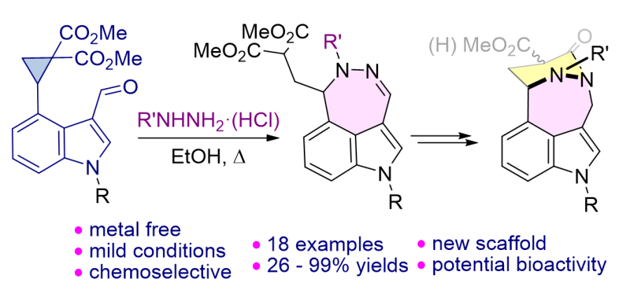 ✓ Развивая исследования по синтезу новых пери-аннелированных индолов из 3-формилиндол-4-ил-замещенных донорно-акцепторных циклопропанов, изучена их реакция с гидразинами. Показано, что даже в отсутствии катализаторов эта реакция приводит к образованию производных [1,2]диазепино[4,5,6-cd]индола; соответствующие циклические карбогидразиды являются эффективными PARP ингибиторами и применяются в качестве антираковых агентов. Пост-модификацией полученных продуктов получены тетрациклические соединения с ранее неизвестным скелетом, являющиеся структурными аналогами ряда биоактивных веществ, а следовательно — перспективные для изучения их физиологической активности.