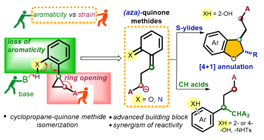 ✓ В составе международной группы исследователей предложен принципиально новый способ активации донорно-акцепторных циклопропанов. Донорно-акцепторные циклопропаны, содержащие в качестве донора орто- или пара-гидроксиарильную группу, а также орто- или пара-тозиламино-замещенную арильную группу при действии основания подвергаются депротонированию и изомеризации образующегося аниона в производное орто- или пара-хинонметида (азахинонметида). Нуклеофильная частица, присутствующая в реакционной среде, атакует хинонметид с восстановлением ароматичности бензольного цикла с образованием продукта формального раскрытия циклопропана данным нуклеофилом. Использование в этой реакции в качестве нуклеофила илидов серы позволяет осуществлять процесс (4+1)-аннелирования с образованием производных 2,3-дигидробензофурана, что имеет важное значение для получения различных фармпрепаратов и соединений с доказанной физиологической активностью, еще не получивших разрешение на использование в качестве лекарств.