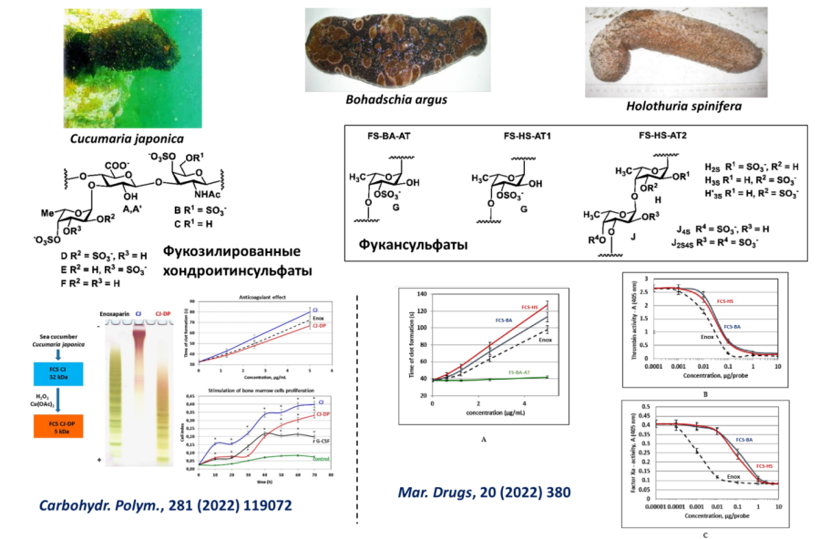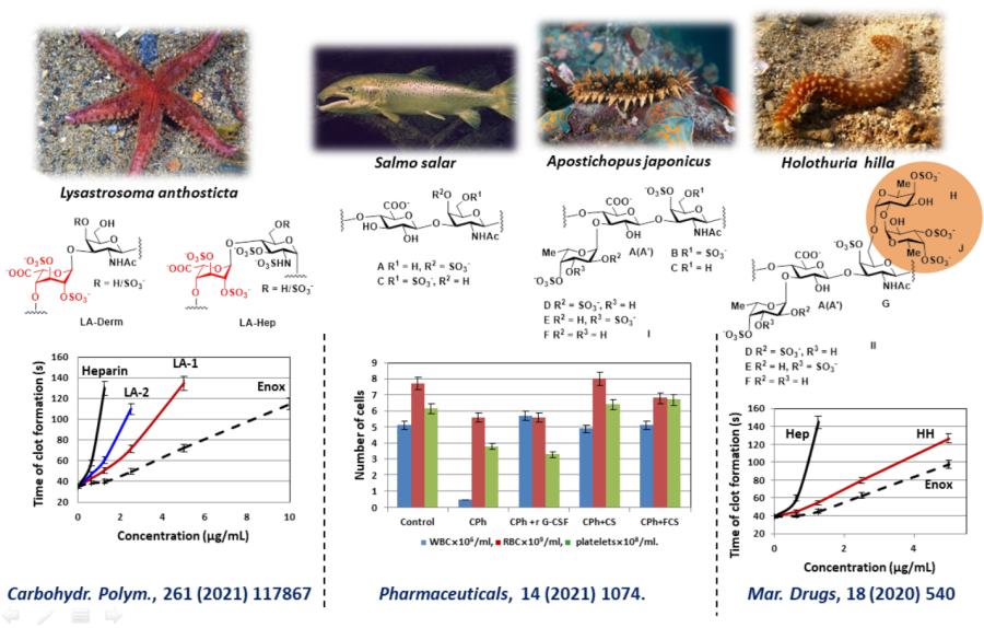 Проведено структурное и биохимическое исследование сульфатированных полисахаридов из морских животных. Так, из морской звезды Lysastrosoma anthosticta были выделены полисахариды дерматансульфат и гепариноид, содержащие необычный моносахаридный фрагмент — 2,3-ди-О-сульфатированную α-L-идуроновую кислоту. Оба полисахарида проявляли высокую антикоагулянтную активность. Аналогично, из морского огурца Holothuria hilla был выделен необычный высокоразветвленный фукозилированный хондроитинсульфат, содержащий фукозные заместители не только при О-3 остатка глюкуроновой кислоты, но и при О-6 остатка N-ацетил-галактозамина. Этот полисахарид является активным антикоагулянтом. Также найдено, что хондроитинсульфат из хряща рыбы Salmo salar и фукозилированный хондроитинсульфат из морского огурца Apostichopus japonicus являются не только антикоагулянтами, но и стимуляторами гемопоэза. Показано, что оба полисахарида эффективно восстанавливают популяции основных типов клеток крови у мышей после иммуносупрессии, вызванной циклофосфаном. Примечательно, что в аналогичных условиях рекомбинантный колониестимулирующий фактор (r G-CSF) восстанавливал только популяцию лейкоцитов. Полученные данные создают основу для разработки востребованных терапевтических стимуляторов гемопоэза нового типа.