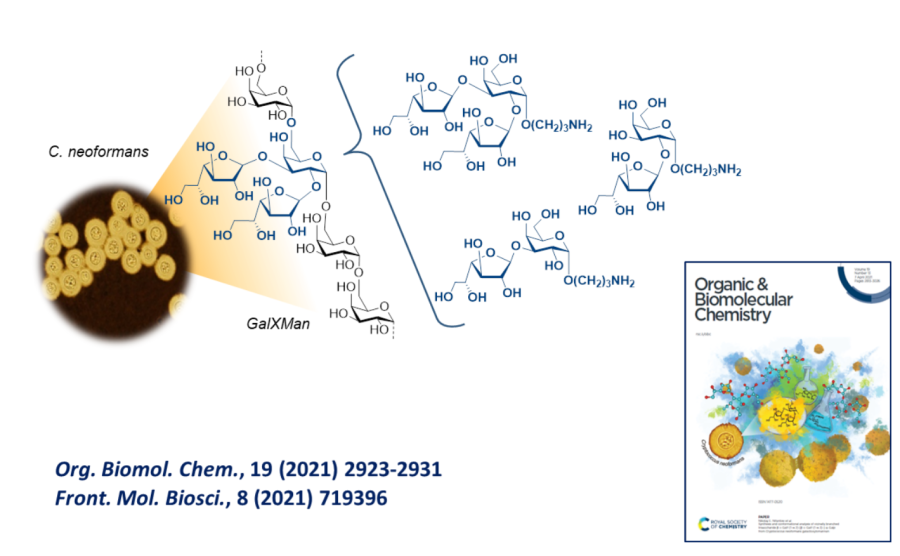 Поверхность клетки патогенных грибов Cryptococcus neoformans покрыта капсулой, состоящей из сложной композиции полисахаридов. Этот патогенный гриб является возбудителем криптококкового менингита (криптококкоза) — тяжёлого инфекционного заболевания, поражающего головной мозг человека, особенно людей с ослабленным иммунитетом — онкобольных, пациентов с ВИЧ и др., но в 5–15% случаев криптококкоз развивается и у условно здоровых пациентов. Взаимодействие полисахаридов C. neoformans с рецепторами на клетках человека приводит к активации иммунитета для нейтрализации патогена. Для выяснения механизма данного процесса и установления фрагментов полисахаридов, распознавание которых может вызвать защитную реакцию иммунной системы, нами проводится систематический синтез соответствующих олигосахаридов и изучение их иммунологических свойств. Так, впервые синтезированы олигосахариды, родственные узлу разветвления недавно открытого галактоксиломаннана (GalXylMan) C. neoformans. С использованием полученных соединений был проведен структурный анализ полисахарида GalXylMan, а также исследование конформационной подвижности узла разветвления и галактофуранозных звеньев в GalXylMan. Полученные данные создали основу для моделирования взаимодействия полисахарида с белковыми рецепторами, а также разработки вакцин и новых диагностических тест-систем для обнаружения инфекции C. neoformans.